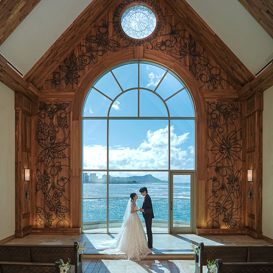 神々が宿るハワイの聖なる木コアウッドのぬくもりで満たされたカウイチャペル。聖なる木とされる「コアウッド」に小花「ナウパカ」の彫刻を施した木目の美しさと温もりが印象的な空間。天窓には山に咲く「マウンテンナウパカ」と海に咲く「ビーチナウパカ」が一つの花を咲かせ、ハワイに伝わる愛の物語を表現しています。