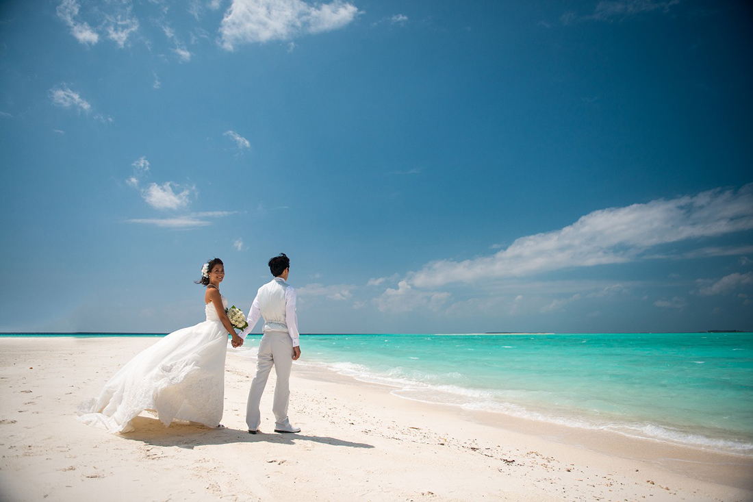フォトグラファー・ヘアメイク・衣装がすべて含まれたモルディブフォトウェディングプラン。衣装は現地で選ぶプランからレイジースーザンウェディングの衣装が含まれたプランまで豊富にご用意。モルディブの透明度抜群のビーチで気軽に撮影を楽しめます。衣装はお好きな衣装を持込も可能です。